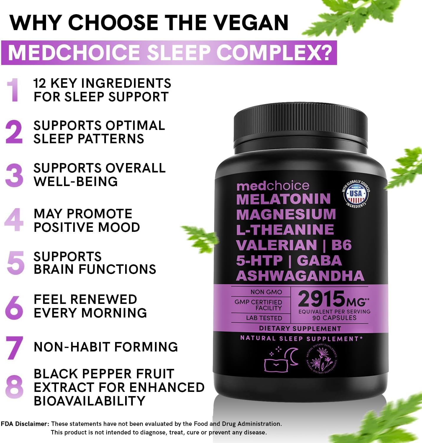MEDCHOICE 12-In-1 Melatonin Sleep Capsules - Natural Sleep Aids for Adults with Melatonin 5Mg and Magnesium Glycinate 500Mg, Sleep Aid with Ashwagandha, L Theanine, Valerian Root, GABA, 5-HTP (90Ct, Pack of 1)