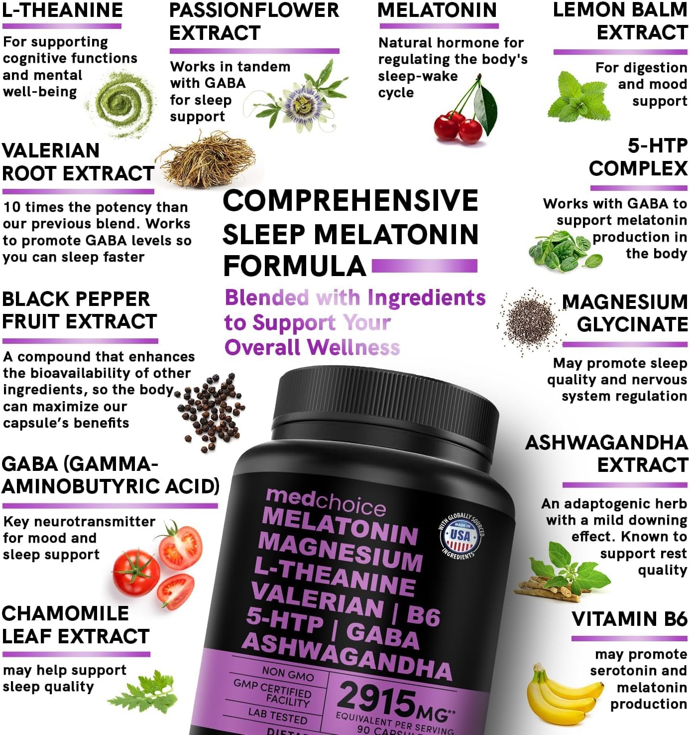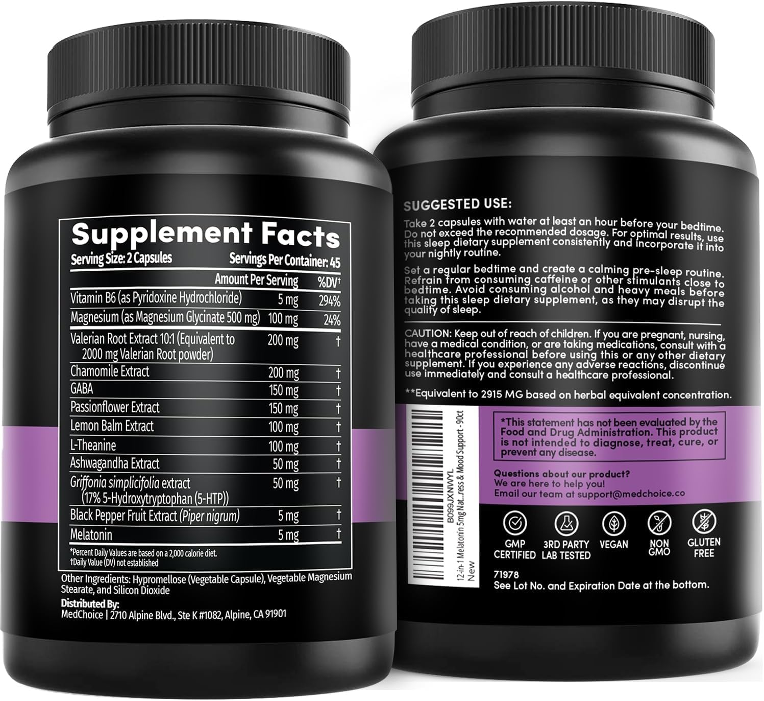 This dietary supplement from MEDCHOICE is designed as a part of your nightly routine. The formula features a blend of ingredients including 5mg of Melatonin, 500mg of Magnesium Glycinate, Ashwagandha, and L-Theanine.This product also contains Valerian Root, GABA, 5-HTP, and Chamomile. It is intended to complement a calm and balanced lifestyle when used in conjunction with a regular sleep schedule.**Product Details:*** Contains 90 vegan capsules.* Formulated for adult use.* For best results, follow the usage instructions on the product label.