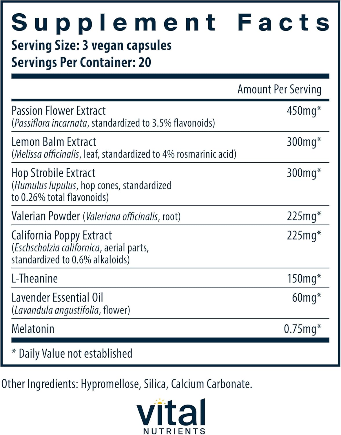 Vital Nutrients Vegan Nighttime Blend combines melatonin with a soothing botanical mix of passion-flower, lemon balm, hops, valerian root, L-theanine, and California poppy.This formula is designed to help support relaxation as part of a calm evening routine.