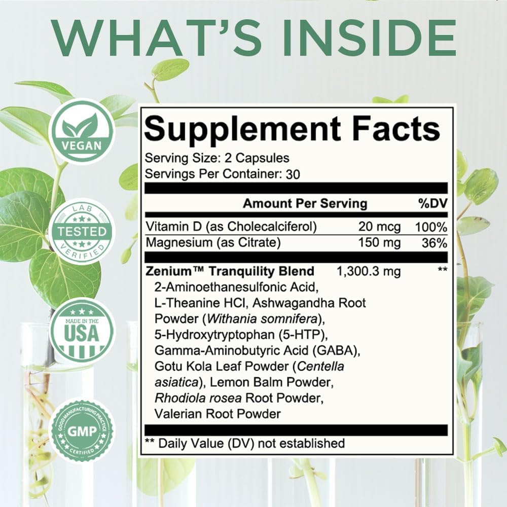 - WE KNOW THE FEELING - Backed by research studies, Zenium's plant-based, vegan formula was beta-tested and perfected over several years by a homeopath who suffered from high-levels stress, worry, and nervousness. Zenium includes Magnesium, Ashwagandha, L-Theanine, and many other adaptogens that have been used in Ayurveda practice and products.